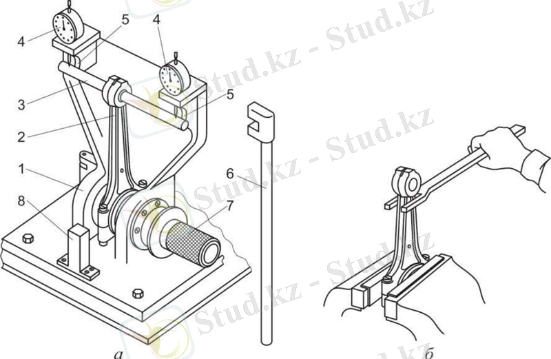 8. 24 -сурет. Шатунды тексеру ( а ) және оның түзетуін қабылдау ( б ) : 1 - құрылғының корпусы; 2 - тексерілетін шатун; 3 және 7 - шатунның жоғарғы және төменгі бастиектеріне арналған жиектемелер; 4 - индикаторлар; 5 - тірек дөңестері, 6 - түзеткіш кілт; 8 - тіреу