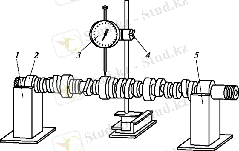 8. 28 - сурет. Тарату білігінің тірек мойнының радиал ауытқымасын анықтау: 1 және 5 - тіректер; 2 - білік; 3 - индикатор; 4 - индикатор қысқышы