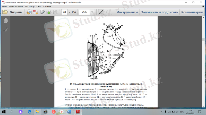 Неге бұлай болатынын жақсы түсіну үшін, ажыратқыштардың жұмыс сызбасын қысқаша қарайық (14-сур. ) . Бос тұрған ажыратқыш басқышы орталық тегерікті 5қысқыш серіппенің серіппелігі есебінен қосылған. (немесе ажыратқыштардың құрылымына байланысты шеткі серіппелер) ажыратқыштың жетектегі тегерігі 2 оған үйкелісті қаптамалармен сермер 1 жəне ажыратқыштың қысқыш тегерігі 3 арасында қысылуы мүмкін. Жетектегі тегерік жəне қысқыш тегерік арасындағы үйкеліс қаптамаларының үйкелістері есебінен оларды бірлесе айналдыру жəне сермерден айналатын кезді 8 беріліс қорабына бірінші білік жəне жетектегі тегеріктің оймакілтек қосылысы арқылы болады. Ажыратқыштың қысқыш тегерігінің қаптамасы 4 сермерге болттармен бекітілгенде, қозғалтқышпен жұмыста ол қысқыш жəне жетектегі ажыратқыш тегеріктері жəне беріліс қораптарының бірінші білігімен бірге сермермен қоса айналады.