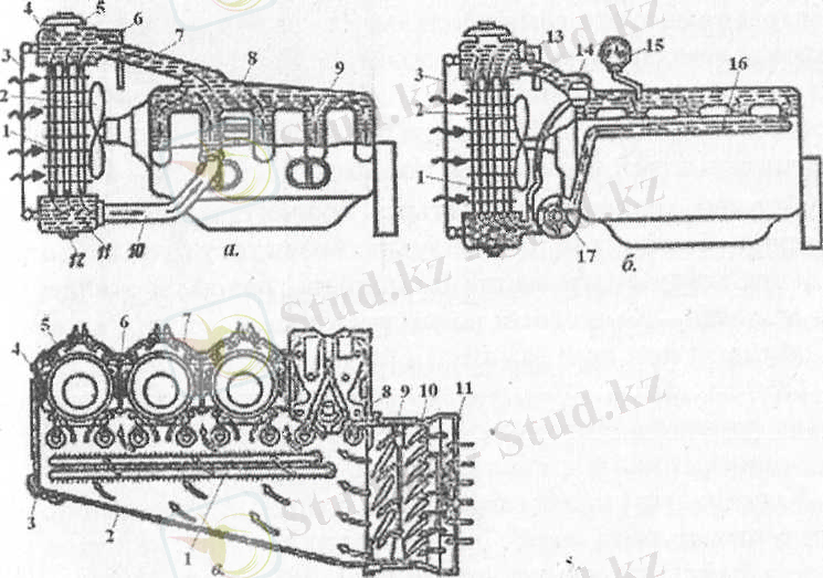 Сұйықтық (термосифонсыз-а, термосифонды- б) және ауамен (в) салқындату жүелері. 1 -радиатор өзектері, 2-желдеткіш, 3-радиатор пердесі, 4-жоғарғы бак, 5-радиатор қақпағы, 6-бу шығаратын тцтік, 7-жогаргы келте тцтік, 8, 9-козгалткыштың блогының су қымтамасы, 10-төменгі түтік. ІІ-төменгі бак, 12-агызу тұжегі, 13-бу-ауа клапаны, 14-термостат, 15-термометр, 16-сщық болу каналы, 17-соргы,