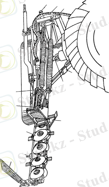 3. 1-сурет. КРН-2, 1А аспалы ротациялық шөп шабатын машина 1 - егістік бөлгіш; 2 - кронштейн; 3- кесу аппараты; 4 - теңестіру механизмі; 5 - кергіш; 6 - таған; 7 - гидрожабдық; 8 - аспаның жақтауы; 9 - тартпа сақтандырғыш; 10 - қимыл механизмі; 11 - тұмсық.