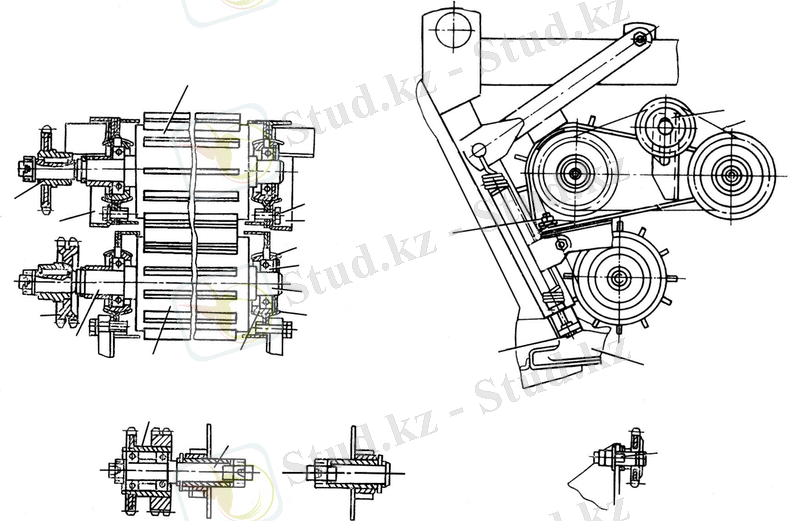 3. 2 - сурет. Жаншитын білдектер . 1 - мойынтіректің бекіту фланеці; 2 - төменгі білдек; 3 - қозғалтқыш цапфа; 4- жұлдызша; 5 - оң жақ кронштейн; 6 - білдек цапфасы; 7 - жоғарғы білдек; 8 - болт; 9 - сол жақ кронштейн; 10 - мойынтіректің шар тәрізді корпусы; 11 - мойынтірек; 12 - білдек цапфасы; 13 - шар тәрізді фланец; 14 - кергіш; 15-регттегіш бұранда; 16 - жұлдызша; 17 - шынжыр; 18 - кесу аппаратының бекіту жақтауының кронштейні; 19 - кергіш құрылғы; 20 - өс; 21 - блок-жұлдызша.