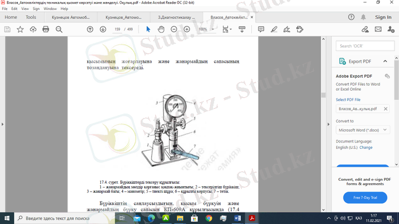 Бүріккіштің саңлаусыздығын, қысым бүркуін және жанармайдың бүрку сапасын КП-609А құрылғысында (17. 4 сурет) көрсетілген стендтегідей орналастырылып тексеріледі. Бүріккіштің саңлаусыздығын тексеру кезінде оның реттеуші білігі ақырын жабылады және тетікті қозғай отырып, қысымды 30 МПа-ға дейін жеткізеді. Осыдан кейін қысымның берілуін тоқтатып, қысымның төмендеуін бақыылайды. Қысым 28 МПа-ға дейін төмендеген кезде секундомерді өшіріп, қысымның 23 МПа-ға дейін төмендеу уақытын бақылайды.