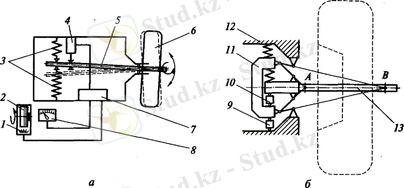 12. 4-сурет. Теңестіргіш стендтердің сұлбасы:а-К-121 мод. доңғалақтардың консольды орналасуы; б - сезгілердің консольды емес; 1 - стробоскопиялық шам; 2 - градуирленген диск; З - тербеліс жүйесі; 4, 9, 10- сезгілер; 5, 13- теңестіргіш біліктер; 6 - теңестірілетін доңғалақ; 7- электронды-өлшеуіш блок; 8- өлшеуіш аспап; 11 - қосымша рама; 12- жылжымайтын рама; А - ішкі тірек нүктесі; В - виртуальды тірек нүктесі.