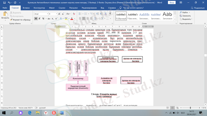 Доңғалақ орнату бұрыштары өндіруші зауыттың ұсынымдарына сəйкес келуі тиіс. Доңғалақ орнату бұрыштарын тексеру аспа бөлшектерін ауыстыру не жөндеуден кейін міндетті, бұл доңғалақ орнату бұрыштарының өзгеруіне алып келуі мүмкін. Автосервисте доңғалақтарлы тексеруді жəне реттеуді арнайы стендте жүргізеді (7. 3-сур. ), ол арбадан, компьютерден, интерфейстік схемадан жəне қуаттану көзінен тұратын жұмыс платформасын білдіреді. Компьютерлік блок жұмысшы компьютерден, монитордан, пернетактадан, тышқаннан жəне принтерден тұрады. Монитор, пернетақта мен тышқан арбаның үстіңгі бөлігінде орналасқан; принтер орта бөлімшесінде орналасқан, ал жүйелік блок арбаның арнайы бөлімшесінде жайғасқан. Стендтің мамандандырылған бағдарламалық қамтамасыз етуі қажетті параметрлерді жылдам əрі сапалы өлшеуге мүмкіндік береді.