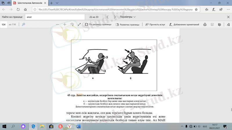 Көлікті жүргізу кезінде қауіпсіздік үшін жүргізушінің өзі жəне қасындағы жолаушысы қауіпсіздік белбеуді таңып алуы тиіс. Ал МАИ қызметкерлері алдында ыңғайсыз жағдайдаға тап болмас үшін көптеген көлік жүргізушілер белбеуді қыстырмай өтірік көзге көрінетіндей жай ғана алдыңғы жағына лақтырып қояды. Бұл дұрыс емес. Тəжірибенің өзі бұған дəлел. Жол апаты кезіндегі көптеген ауыр жарақаттар, тіпті жүргізуші мен жолаушының соқтығу кезінде көліктен шығып кетуі осы белдеуді қыстырып қоймағаннан туындайды екен. Бұдан басқа, қауіпсіздік белбеуі жүргізуші мен жолаушының көлік шанағындағы кейбір элементтеріне соқтығысып, бас, омыртқа мен төс қуысына зиян келуінен жəне жарақат алуынан қорғайды (43 сурет) .