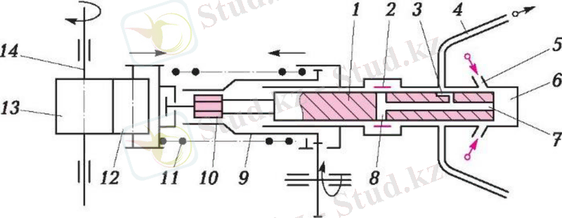 Жоғары қысымды жанармай сорғылары. ЖҚЖС мысқалды және тарату типтерін бөліп қарастырады. Конструкциясы мен реттелу қарапайымдылығымен ерекшеленетін тарату типіндегі жанармай сорғылары ең көп таралған (1. 16-сурет) . Оларға тән ерекшелік әрбір плунжерлік жұп бір емес, бір мезгілде қозғалтқыштың бірнеше цилиндріне қызмет көрсетеді. Тарату типіндегі жанармай сорғысындағы плунжер күрделі қозғалыс жасайды: кері қайтару-үдемелі (сорғы әрекеті) өз осіне қатысты айналу қозғалысымен қоса атқарылады (тарату әрекеті) . Плунжердің төмен қозғалысы (сору барысы) итергіш 12 арқылы плунжерге 1 әсер ететін серіппенің күшімен 11 жүзеге асырылады. Плунжердің кері қозғалысы (айдамалау барысы) итергіш 12 арқылы жұдырықшаның 13 әсерімен орын алады, бұл ретте серіппе 11 жиырылады. Плунжер айналу қозғалысын реттеуші білігі және тісті төлке 9 арқылы жұдырықша білігінен 14 алады. Серіппенің 11 әсерінен плунжердің 1 қозғалысы кезінде гильзаның плунжер үстіндегі қуысында 6 сиретілу орын алады. Орнын ауыстырған плунжер жіберу каналдарын 5 ашып, солар арқылы жанармай плунжер үстіндегі қуысты толтырады. Одан кейін жұдырықшаның 13 әсерімен плунжер кері жүріс жасайды, осы процесте жіберу каналдары 5 жабылады да, жанармай сығыла бастайды. Осы кезде тарату ойығы 3 плунжер айналып тұрған кезде цилиндрлердің бірінің жанармай айдамалау каналына 4 қарсы орналасады. Плунжер үстіндегі қуыстан жанармай қысыммен плунжердің орталық каналы 7 және оның тарату ойығы 3 арқылы жанармай айдамалау каналына 4 келіп түседі. Жанармайдың цилиндрге берілуі плунжердің бөлік ойығы 8 мөлшерлеуіштен 2 шықпайынша және плунжер үстіндегі қысым орталық канал 7 және плунжердің ашық бөлік ойығы 8 арқылы жанармайды жіберу салдарынан төмендемейінше жалғаса береді.