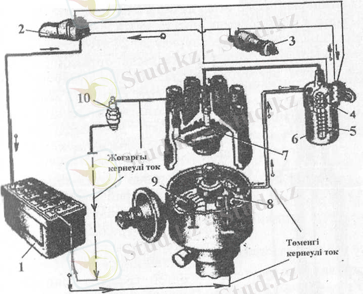 1-аккумулятор батареясы, 2-стартерді қосқыш, 3-оталдыру қосқышы, 4-алгашқы орама, 5-екінші орама, 6-оталу катушкасы, 7-таратқыш, 8-үзгіш, 9-конденсатор, 10-оталу шамы