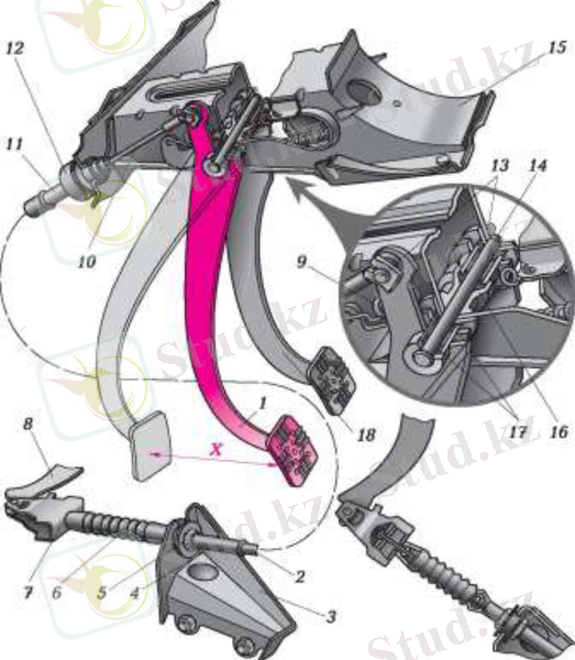 6. 4-сур. Арқандық жетегі бар іліністы реттеу : 1 - ілініс тепкісі; 2 - арқанның сырты; 3 - арқан сыртының астынғы ұшын бекіту кронштейны; 4 - арқан сыртының астынғы ұшы; 5 - сомын; 6 - қорғаныс тысқабы; 7 - арқанның шылбыры; 8 - іліністы өшіру айырының тетігі; 9 - ілініс тепкісінің созба серіппесі; 10 - рқан; 11 - арқан сыртының үстінгі ұшын; 12 - құрсау; 13 - тоқтатқыш қапсырмалар; 14 - тепкілердің осі; 15 - ілініс пен тежегіш тепкілерінің кронштейні; 16 - дистанциялық төлке; 17 - ілініс тепкісінің төлкесі; 18 - тежегіш тепкісі; Х - ілініс тепкісінің жүрі