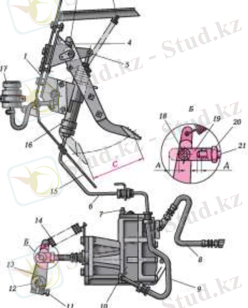 6. 5-сур. Пневмогидравликалық жетегі бар іліністы реттеу : 1 - тепкіштің астынғы тіреуі; 2 - тепкі; 3 - созылмалы серіппе; 4 - жылжымалы тіреу (реттеуші бұрандама) ; 5 - эксцентриктік саусақ; 6 -гидравликалық жетектің түтігі; 7 - қайта шығаратын клапан; 8 - ауаны күшейткішке апаратын құбыршегі; 9 - гидравликалық жетектің құбыршегі; 10 - пневмогидравликалық күшейткіш; 11 - тартпалы бұрандама; 12 - іліністы өшіретін айыр; 13 - іліністы өшіретін айырдың тетігі; 14 - серіппе; 15 - кабина алдынығ қалқаны; 16 - негізгі цилиндр; 17 - негізгі цилиндрдің кеспегі; 18 - аусақ; 19 - итергіштің айыры; 20 - контрсомын; 21 - итергіш; А - іліністы өшіретін муфтаның жүрісіне сәйкес келетін итергіштің бос жүрісі; С - ілініс тепкінің толық жүрісі; Д - айырдың ойық тесігінен итергіштің бүйіржақ шығыңқы жерінің көлемі