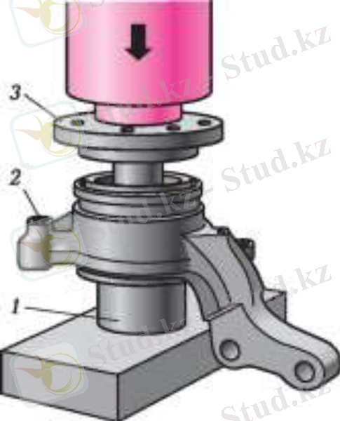 7. 6. Запрессовка подшипника в поворотный кулак: 1 - поворотный кулак; 2 - подшипник; 3 - оправка