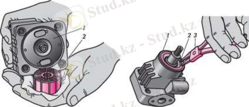Рөлдік күшеткіш сорғышын бөлшектеу . Сорғышты автомобильден шешу, алдын ала майды ағызып, сыртқы бетін тазалау керек. Содан кейін келесі операцияларды оорындау қажет: бак пен сүзгіштің қақпағын ашу, төрт бұрандаманы босатып, бакты шешу, білік тік орналасатындай, ал шкив астында тұратндай етіп сорғышты орнату, төрт бұрандаманы босату жəне сорғыштың қақпағын шешу. Қақпақты шешкен кезде клапанды құлатпай ұстап тұру, үлестіргіш дискті статорға қатысты орналасуын белгілеу жəне оны сұққыштардан шешіп алу. Осыдан кейін статордың сорғыштың корпусына қатысты орналасуын белгілеу жəне роторды қалақтарымен қоса шешу (7. 37-сур. ) . Өте қажет болған жағдайда алынғыштың көмегімен шкивті, тоқтатқыш сақинаны (7. 38-сур. ) жəне сорғыштың білігін шарикті мойынтірегімен қоса шешу. Статор, ротор жəне сорғыш пластиналар өндіруші зауытта жеке сұрыпталған, сондықтан бөлшектегенде олардың жинақтылығын бұзуға, пластиналарды орнымен ауыстыруға болмайды. Статорды, ротор мен пластинаны тек жинақпен ауыстырған дұрыс.
