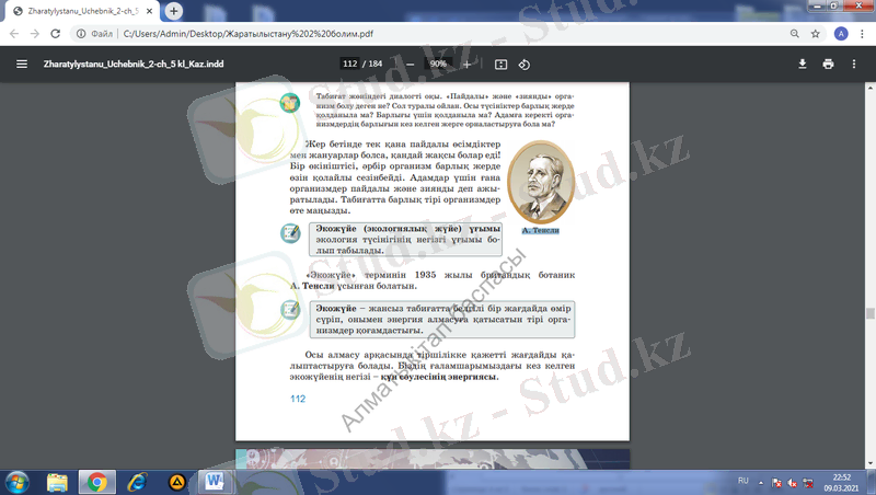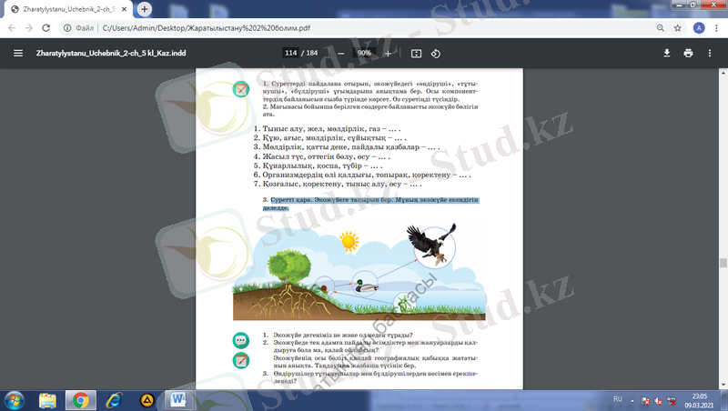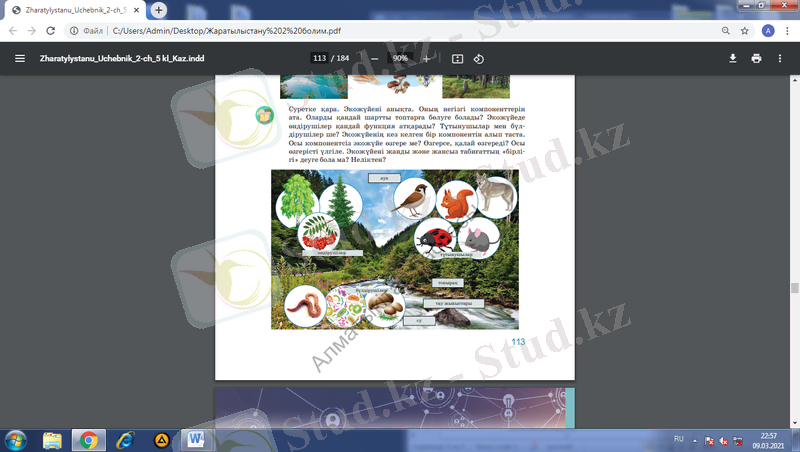 1. Суретке қарайды. Экожүйені анықтайды. Оның негізгі компоненттерін атайды. Оларды қандай шартты топтарға бөлуге болады? Экожүйеде өндірушілер қандай функция атқарады? Тұтынушылар мен бүлдірушілер ше? Экожүйенің кез келген бір компонентін алып тастайды. Осы компонентсіз экожүйе өзгере ме? Өзгерсе, қалай өзгереді? Осы өзгерісті үлгілейді. Экожүйені жанды және жансыз табиғаттың «бірлігі» деуге бола ма? Неліктен?