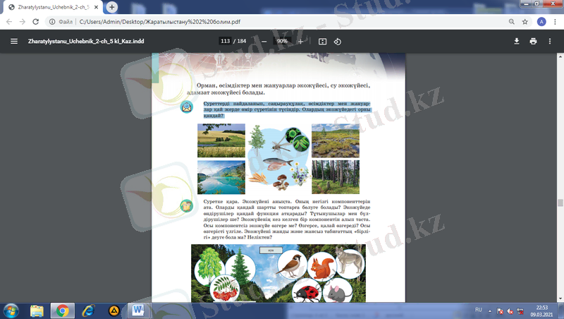 1. Суретті қарайды. Экожүйеге тақырып береді. Мұның экожүйе екендігін дәлелдейді.