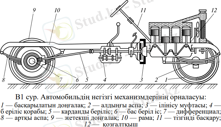 Автомобиль негізгі үш бөліктен тұрады: шанақ, шасси және қозғалтқыш. Шанақ жүргізушіні, жолаушылар мен жүкті орналастыруға арналған. Автобустар мен жеңіл автомобильдердің шанағы деп жүргізуші мен жолаушылары бар салонды айтады. Жүк автомобильдерінде шанақ жүргізушінің жұмыс орны болып саналатын кабинадан, жүктерді және жолаушыларды (борттық платформа болған жағдайда) тасымалдауға арналған платформалардан тұрады. Шасси үш механизмнен тұрады: трансмиссия, қозғалыс бөлігі және басқару механизмі (В1 сурет) . Трансмиссия қозғалтқыштың иінді білігінен автомобильдің жетекші доңғалағына дейін айналу кезін жібереді. Оның құрамына ілінісу муфтасы 3, беріліс қорабы 4, карданды беріліс 5, басты беріліс 6, дифференциал 7, доңғалақтың жетекті біліктері кіреді. Автомобильдің қозғалыс бөлігіне рама 10, аспалар 2 және 8, амортизаторлар, 1 және 9 доңғалақтары, алдыңғы білік және артқы белдік қаптамасы кіреді. Автомобильдің басқару механизміне тежеуіш пен тізгінді басқару 11 жатады. Тежеуіш автомобильдің қозғалыс жылдамдығын бәсеңдетуге әрі толық тоқтатуға арналған. Тізгінді басқару автомобильдің қозғалу бағытын өзгерту үшін қажет. Қозғалтқыш 12 - жылу энергиясын мехникалық жұмысқа айналдыратын күш қондырғысы.