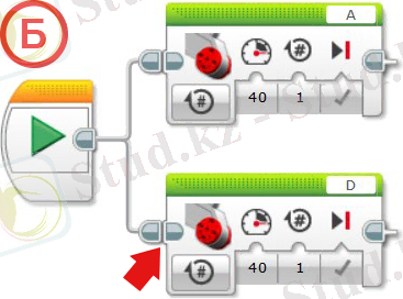 СТАРТ блогын үлкен мотордың бірінші блогына қосыңыз (А суреті) . Содан кейін СТАРТ блогын үлкен мотордың екінші блогына қосыңыз (Б суреті) .