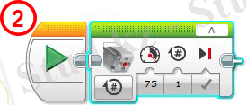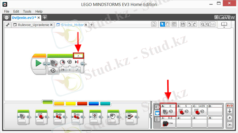 Жасыл вкладкадағы Үлкен Мотор блогын (Large Motor) таңдаңыз (Сурет. А) . Оны СТАРТ блогына жалғаңыз (Сурет. Б) .
