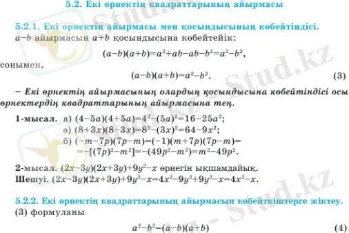 - алгебралық өрнектерді ықшамдауда қысқаша көбейту формулаларын қолданады;