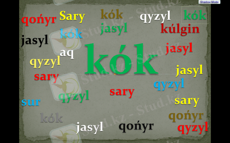 Әр слайдта түстердің аты оған сәйкес емес түспен жазылады. Сдайдты тез ауыстырып отырылады, балалар сөзді оқи отырып, тез сол сөздің түсін дұрыс айту керек.