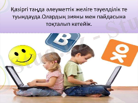 Бүгінгі тәрбие сабағымызда «Ғаламтордың пайдасы мен зияны»туралы көп мәлімет алдыңыздар деп ойлаймын. Күнделікті тұрмыста ғаламторды дұрыс мақсатта қолдана білейік. Денсаулығымызға зиян келмейтіндей ақыл кеңестерді тиімді пайдала біліңдер.