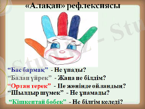 Рефлексия «Алақан». - Мына алақанның әрбір саусағына өздеріңіздің бүгінге тәрбие сағатында көңіл күйлеріңізді, алған әсерлеріңізді жазыңыздар.