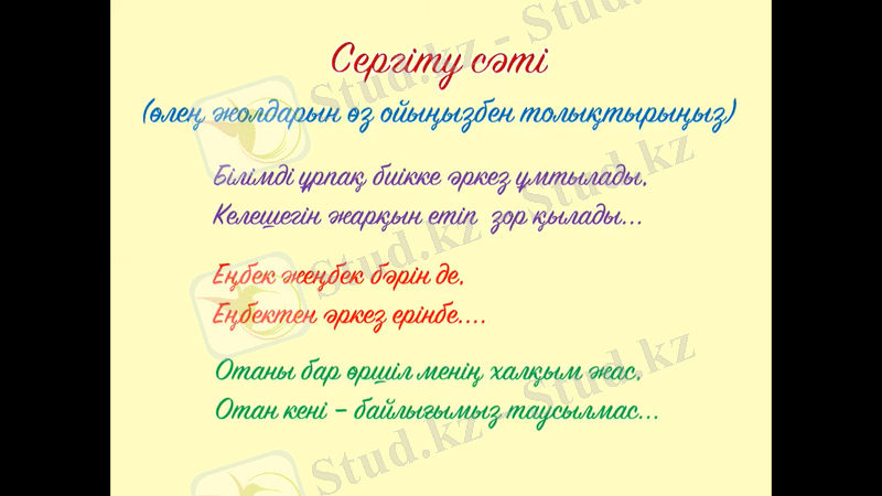 Қазақ халқының дәстүрлі тәлім-тәрбие беру жүйесінде жас кезінен бастап баланы еңбекке, белгілі бір кәсіпке баулыған. Жалқау, еріншек, жатып ішер арамтамақ болма, еңбек ет, ата-анаңа қолқанат бол дегенді баланың санасына құйып отырған. Әрбір жас бала “Еңбек етсең ерінбей, тояды қарның тіленбей” деген мақал рухында тәрбиеленген. Ал, сіздер қалай ойлайсыздар, «Еңбек етсең ерінбей, тояды қарның тіленбей» деген мақалдың мағынасы қалай, қалай түсіндірер едіңдер? «Бақыттың кілті еңбекте» дегенді қалай түсінесіңдер? (Оқушылар мақалдың мағынасын ашады)