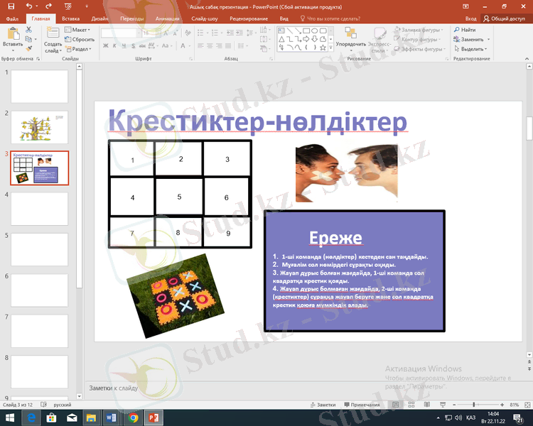 «Крестиктер-нөлдіктер» әдісі арқылы өтілеген сабақтан сұрақтар мен термин сөздер келтіріледі.