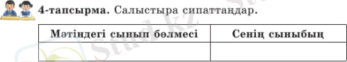 Қолдану. 4-тапсырма. Салыстыра сипатта. Мәтіндегі сынып бөлмесі. «Сенің сыныбың»