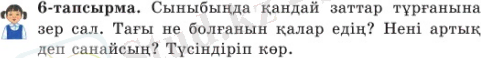 Талдау. Айтылым. 6-тапсырма. Сыныбыңда қандай заттар тұрғанына зер сал. Тағы не болғанын қалар едің? Нені артық деп санайсың. Түсіндіріп көр.