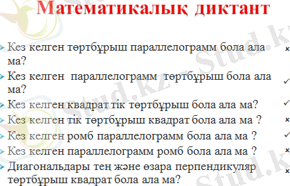 Оқушылар параллелограмм фигурасының қасиеттерін айтады