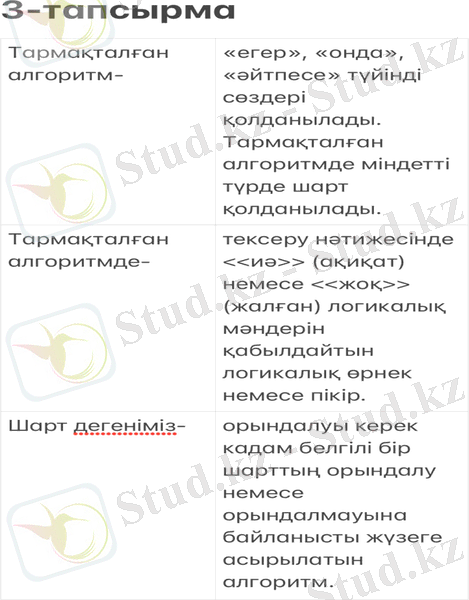Мақсаты: өмірмен байланысты алгоритм құрайды, мысал келтіреді. Шартты тексеру операторын бағдарлама құруда қолданады.