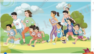 Бірінші, екінші, соңғы болып жүгіріп келе жатқан жарысқа қатысушылардың нөмірін ата. Сурет бойынша сұрақтар құрастыр.