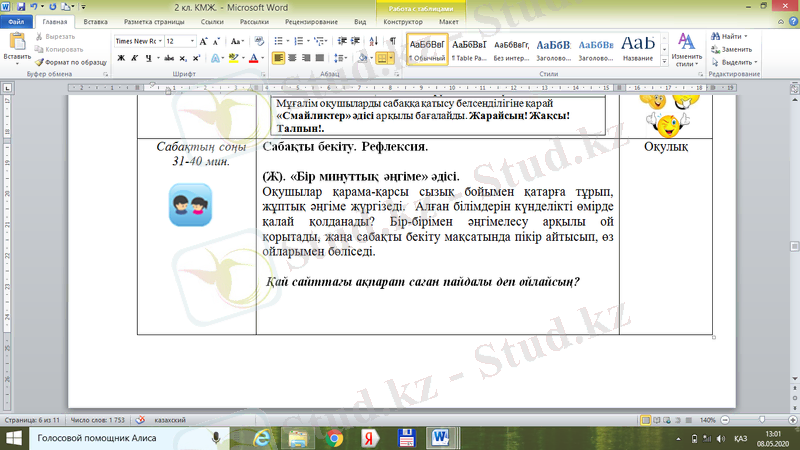 а) Оқушылармен сәлемдесу, түгендеу. Психологиялық жағымды ахуал туғызу үшін «Жақсы сөз жарым ырыс…» әдісін пайдаланып, оқушылар бір- біріне жақсы тілектер айтады;