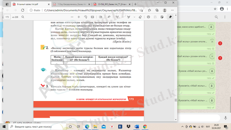 Мәтін бойынша сұрақтарға жауап береді, мәселеге өз ойын айтады, жспар құрады.