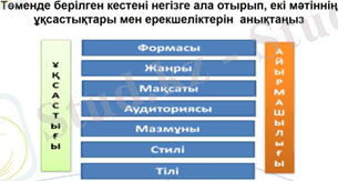 - Екі мәтіннің тақырыбын, түрлерін салыстырып, ерекшеліктерін анықтайды.