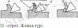 б) . Жаңа тақырыпты түсіндіру. Металл кескіш жабдықтардың топталуы: Металдарды кесу, шабу деп - дайындамадан металл қабаты бөлінін алынатын немесе дайындаманы бөліктерге бөлетін өңдеу операциясы аталады. Крейцмейсель немесе шапқының жұмыс (кескіш) бөліктерінің пішіндеріне сәйкес сынаның әсері, металдарды шабудың физикалық негізі болып табылады. Металдарды шабу операциясы дайындамаларды станокта өңдеу қиын немесе тиімсіз болған жағдайда қолданылады. Металдарды шабу арқылы дайындаманың бетін тегістеуге, оның бетіндегі қатты қабатты шабуға, бөлшектердің үшкір жиектерін өңдеуге, жырықшалар мен ойықтарды алуға, қалыңтыр металдарды бөліктерге бөлуге және т. б. болады. Металдарды шабу, әдетте, қысқыштардың көмегімен жүргізіледі. Қалыңтыр металдарды бөліктерге шауып бөлуді тегіс металл плиталардың үстінде жүргізуге болады. Металдарды шабу кезінде негізгі кескіш аспаптар ретінде крейцмейсель немесе шапқы, ал соғу аспабы ретінде балға қолданылады. Ұсталық шапқы - бұл аспапты көміртекті болаттан дайындалған стержень. Ол үш бөліктен тұрады: 1 - соғатын бөлігі; 2 - ортаңғы бөлігі; 3 - жұмыс (кесу) бөлігі. Шапқының соғатын бөлігі жоғары қарай жіңішкеріп, ал төбесі дөңгеленіп жасалған. Шапқының ортаңғы бөлігі шабу кезінде ұстауға арналған. Жұмыс (кесу) бөлігі сына тәрізді. Сынаның үшкірлеу бұрышы өңделетін материалдың қаттылығына байланысты таңдалып алынады. і Кеңінен қолданылатын материалдарды шабуға ұсынылатын сынаның үшкірлеу бұрыштарының мәндері: - қатты материалдар үшін (қатты болат, шойын) ¬- 70 о; - қаттылықтары орташа материалдар үшін (болаттар) - 60 о; - жұмсақ материалдар үшін (мыс, жез) - 45 о; - алюминий қорытпалары үшін - 35 о. Шапқының соғатын және кесетін бөліктері термиялық (шынықтыру, жұмсарту) өңделеді. Шапқының шынықтырылу дәрежесін егеу арқылы анықтауға болады. Ол үшін егеуді шапқының шынықтырылған бетімен жүргізеді. Егер егеу шапқының бетімен «сырғанайтын» болса, онда ол жақсы шынықтырылған. Крейцмейсель - шапқыға үқсас аспап, айырмашылығы, оның кесу жиегі жіңішке. Крейцмейсель жіңішке ойықтар мен жырықшаларды шабуға арналған. Крейцмейсельмен металдардың қалың қабатында бірнеше жырықшалар ойылып, олардың арасындағы металды шапқымен шабады. Әр түрлі пішінді ойықтарды шабу үшін арнаулы крейцмейсельдер қолданылады. Олардың айырмашылығы тек кесу жиегінің пішінде ғана. Металдарды шабу кезінде денені дұрыс ұстаудың (жұмыс істеушінің денесі мен аяғын ұстауы), кескіш аспаптарды дұрыс ұстаудың және балғамен соғуды орындау техникасының маңызы зор. Балғамен соғу кезінде дененің ауырлық центрі тұрақты болуы керек. Ол үшін жұмыс істеушінің денесі тік және қысқыш осіне 45 о шамасында жартылай бұрылып, табандарының ось сызықтары 40 о болатындай сол жақ аяғы жарты қадам алға қарай тұруы керек. Шапқыны оның соғатын бөлігінің шетінен 15-20 мм төмен, ортаңғы бөлігінен ұстау керек. Шапқының кесу жиегі жаңқа алынатын сызыққа (кесу сызығы) қойылады. Шапқының бойлық осі өңделетін металдың бетіне 30-35 о бұрышпен, ал қысқыштың бойлық осіне 45 о бұрышпен орналасқаны дұрыс. Балғаны, оның сабының шетінен 15-20 мм төмен, оң қолмен ұстайды. Балғаның сабын барлық саусақтармен қатты қысып, шапқының соғатын бөлігінің тең ортасынан қатты соғу керек. Балғамен соғуды орындау білектің, шынтақтың немесе иықтың көмегімен болуы мүмкін. Білектің көмегімен 
