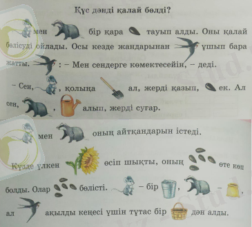 (Т) «Болжау стратегиясы» бойынша «Құс дәнді қалай бөлді?» мәтінін суреттердің көмегімен болжау.