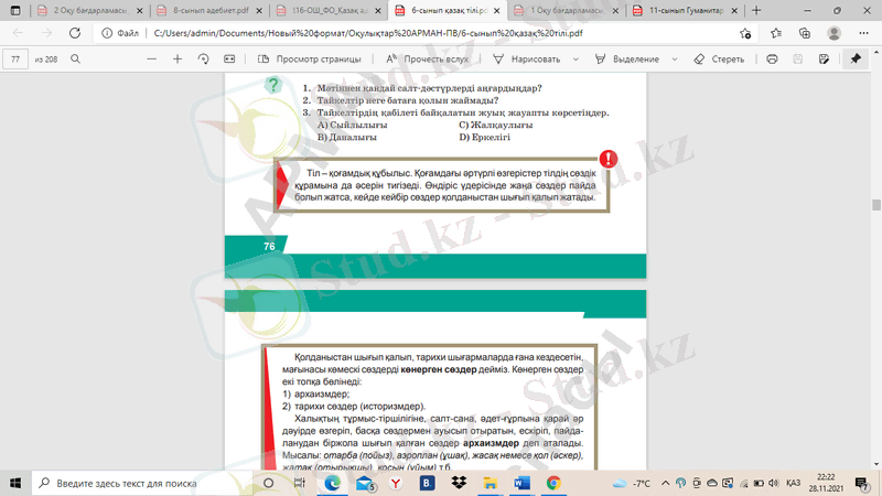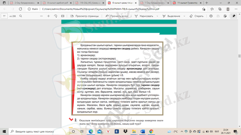 - Мәтіннен көнерген сөздерді табады. Архаизм мен тарихи сөздерге ажыратып жазады.