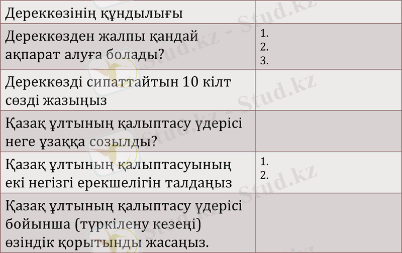 Тапсырма 1. Өткен біліміңді және дереккөзді қолдана отырып берілген кестені толтырыңыз.