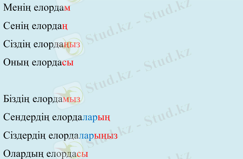 Мәтіндегі тірек сөздерге тәуелдік жалғауын жалғап жазады.