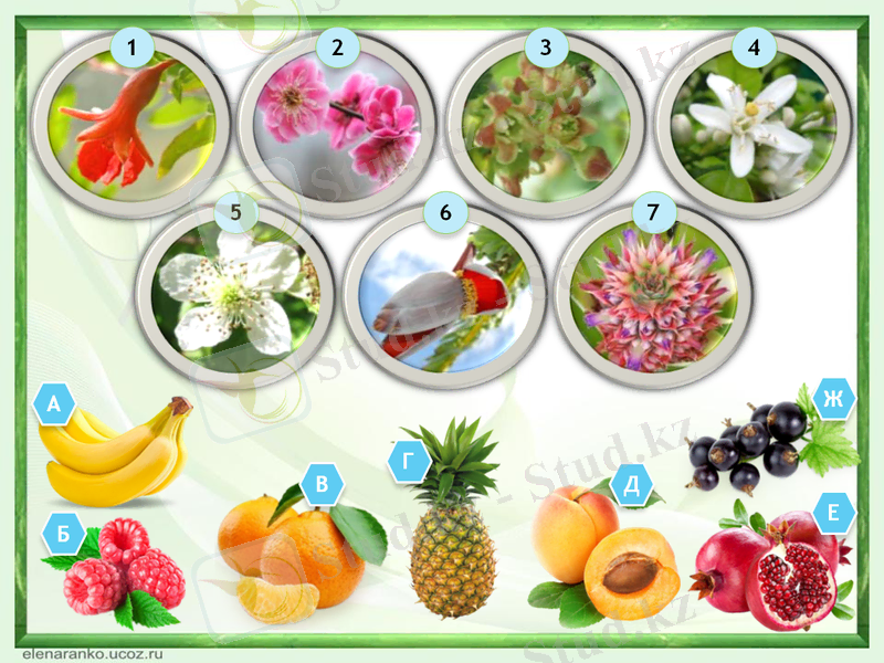 Берілген суретте жемістер мен гүлдердің сәйкестіктерін табыңдар.
