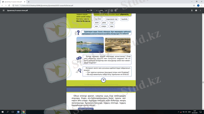 Оқулықта 95- бетте берілген картадан өзеннің (теңіз, көлдің) атауына қатысты немесе «су» сөзі бар қалаларды тап.