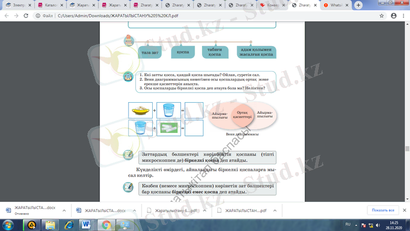 1. Екі затты қосса, қандай қоспа шығады? Ойланып, суретін салады.