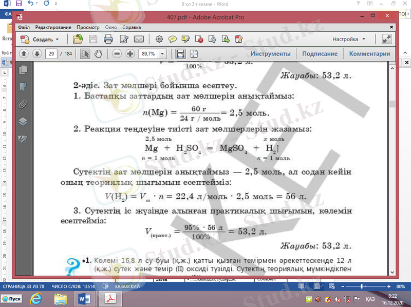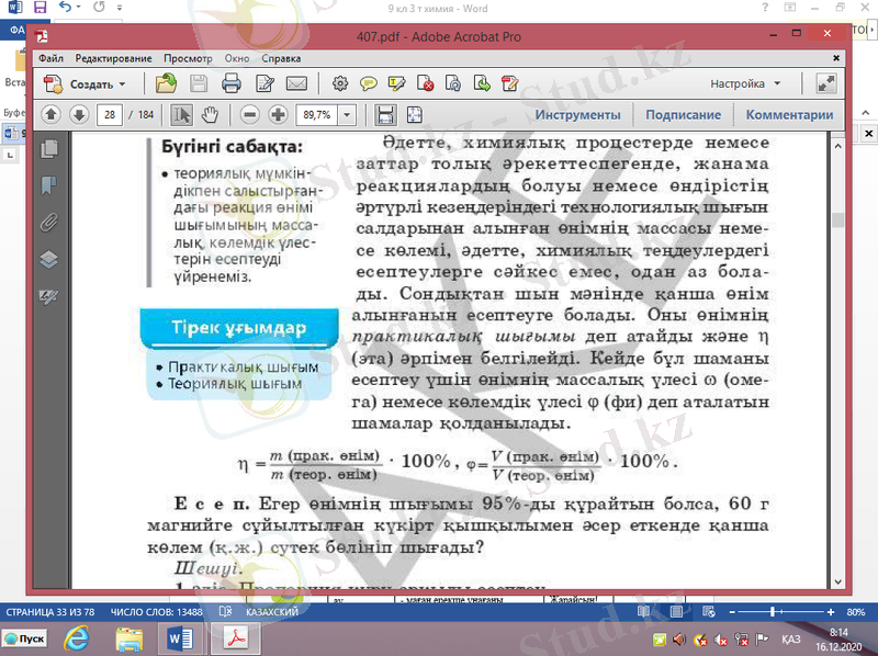 Сабақтың тақырыбы: Есеп шығару«Теориялық мүмкіндікпен салыстырғандағы реакция өнімі шығымының массалық /көлемдік үлестеріне есептеулер»