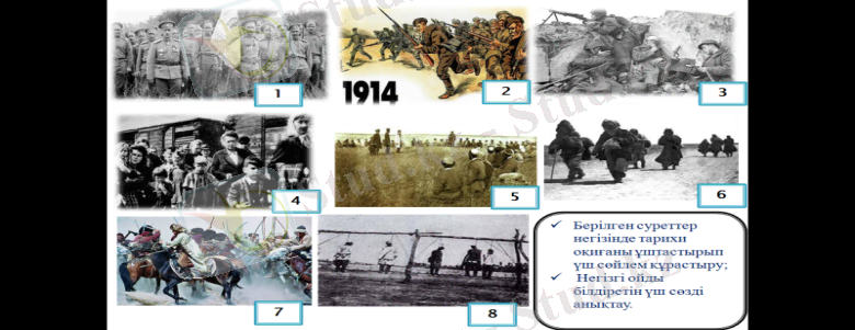 1. Суреттерді мазмұнына қарай ретімен орналастыру (бірінші дүниежүзілік соғыс) ;