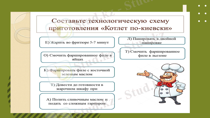 3. берілген технологиялық сұлба бойынша киевше котлеттің дайындалу реттілігін орыс тілінде тауып оқып қазақ тілінде аударып оқу.