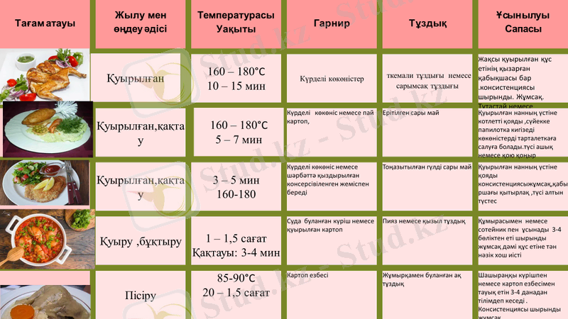 1. Құс пен жабайы қанаттылардан әзірленгентағамдардың түрлерін олардың дайындау технологияларын кәсіби деңгейде әзірлеу әдісің меңгереді.