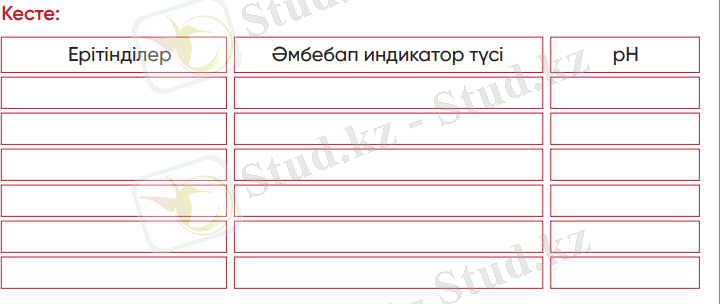 7. 3. 4. 2 - рН шкаласы негізінде әмбебап индикаторды қолданып, сілтілер мен қышқылдарды анықтай алу.