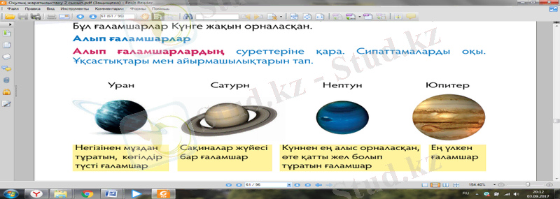 - Ғаламшарларды атап шығыңдар (Меркурий, Шолпан, Марс, Жер, Юпитер, Сатурн, Нептун, Уран) .