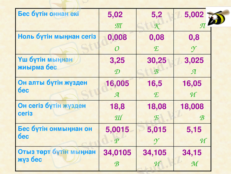 - «Оқылуына сәйкес санды тап» (сандарды дұрыс тапса, сандардың астындағы әріптерден ең кішкентай құстың атын оқиды)